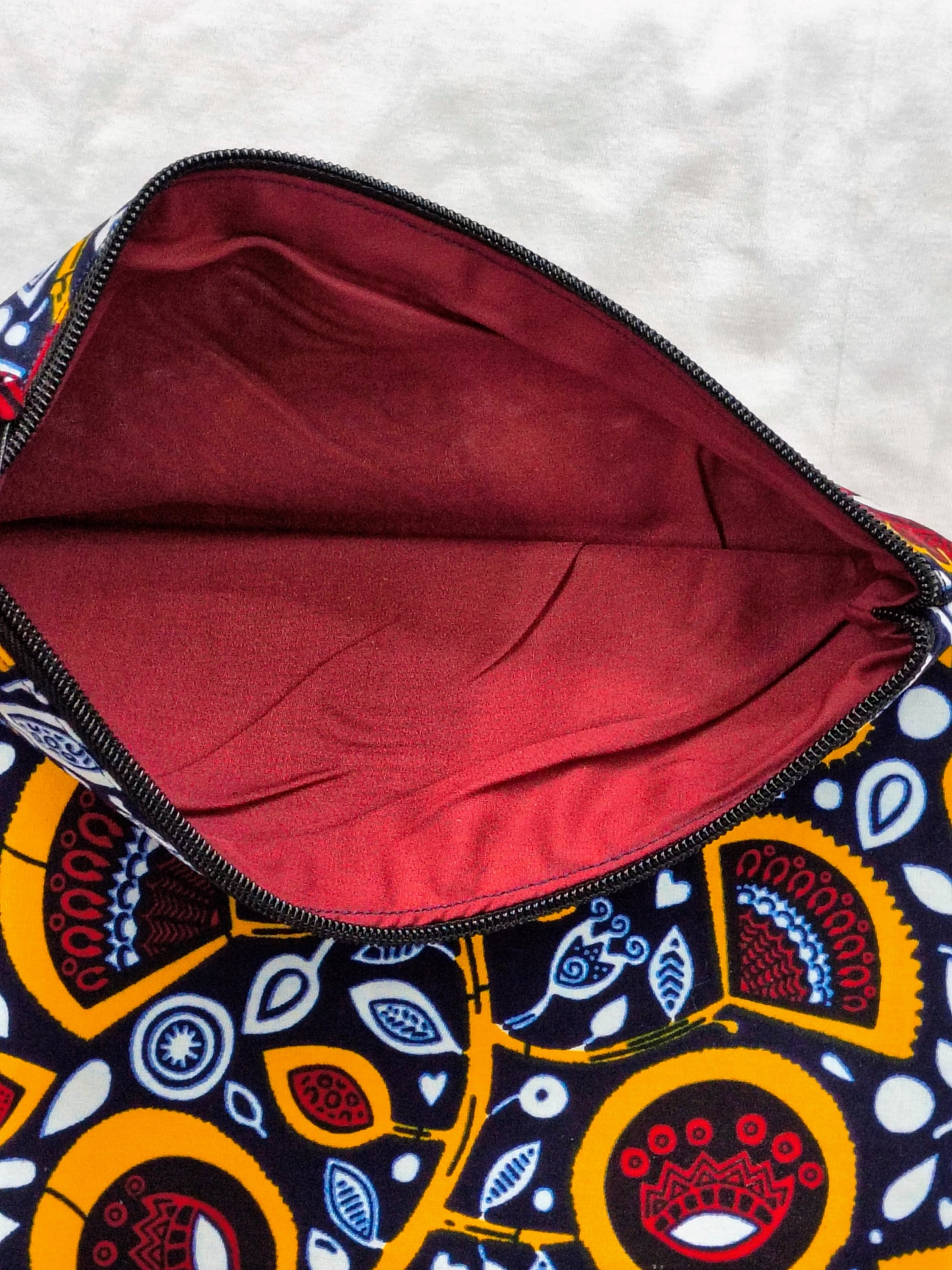 Because your accessories should feel as good as they look. This handmade mini asymmetric fold-over clutch is crafted from authentic Ankara African print fabric in vibrant gold, red, and navy patterns—each one totally unique, just like you. The rich burgundy lining adds a little hidden luxury every time you unzip it, giving you that yes-I-deserve-this feeling.